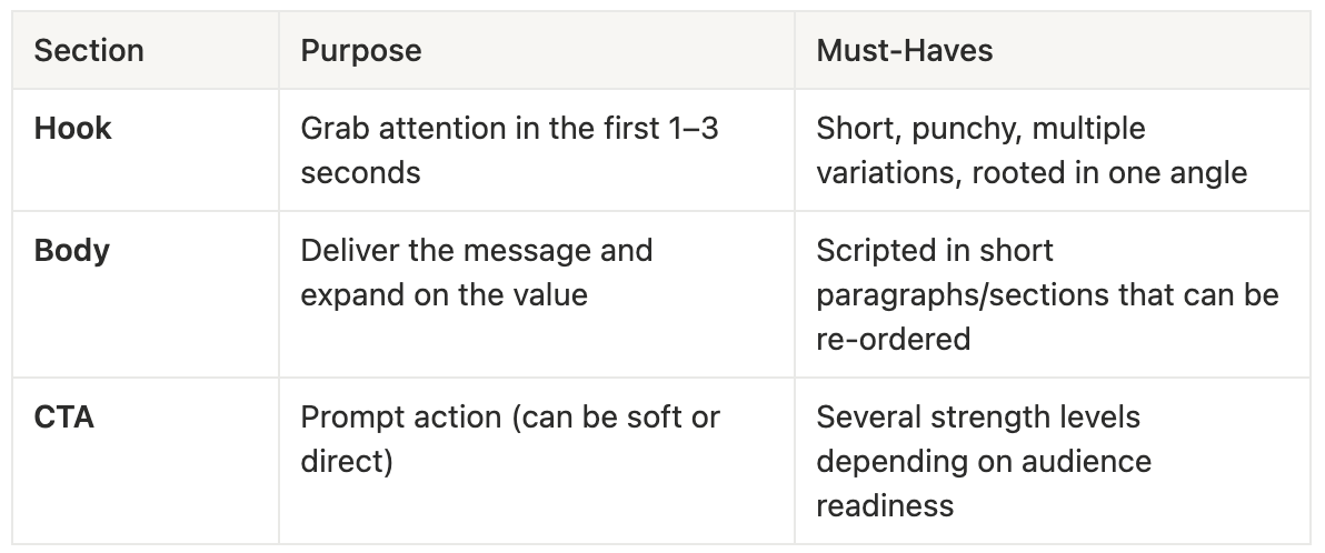 Think of these as plug-and-play building bricks that can be reordered or swapped based on the hook or CTA.