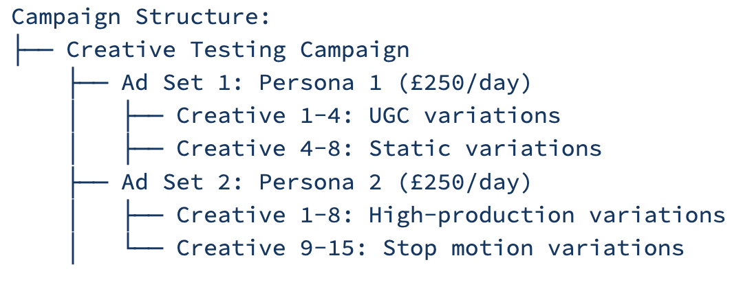 This example assumes a testing budget of ~£15k/monthly and an AOV of ~£50 meaning a £150 daily ad set budget is a sound approach. The approach is highly consolidated to ensure budget is going to high performers in the shortest possible time.
