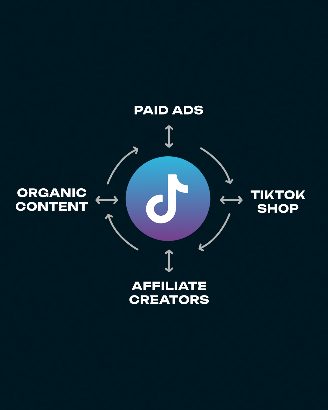 Approach TikTok as an interconnected system in which each part - Paid Ads, Affiliates, Organic, TikTok Shop - feeds and informs the others. The output of one becomes the input of the next, compounding learning velocity and efficiency.